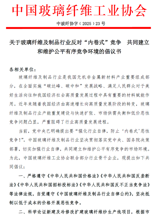《复价告知函》中提到,此次复价是基于当前市场行情及该公司产品结构调整、成本变化等因素综合考虑,旨在优化产品供应结构,提升经营业绩稳定性。无独有偶,中国玻璃纤维工业协会也于今天发布了《关于玻璃纤维及制品行业反对“内卷式”竞争 共同建立和维护公平有序竞争环境的倡议书》, 联合倡议单位涵盖了玻纤行业各骨干企业,包括:巨石集团、泰山玻纤、国际复材、山东玻纤、长海股份、冀中新材、四川威玻、重庆三磊、天皓玻纤。该倡议旨在加强行业自律,共同建立和维护公平有序竞争的市场环境,当前,玻璃纤维及制品行业产能重复建设与快速扩张、市场供需失衡和低价恶性竞争问题凸显,严重阻碍了行业高质量发展进程。正如尼采所说:“当你凝视深渊时,深渊也在凝视你。” 过度内卷会让整个行业陷入恶性循环,真正的进步应该来自于创新与合作,而非无休止的恶性竞争。